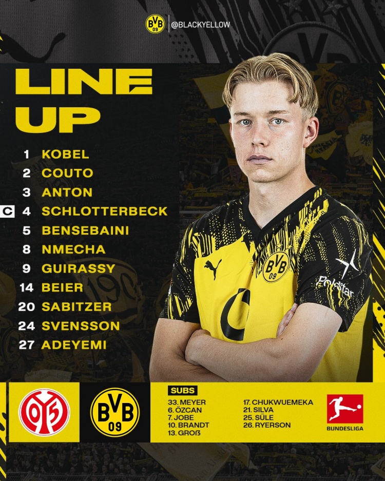 多特vs美因茨首发:萨比策、阿德耶米在列,吉拉西赛前热身伤退