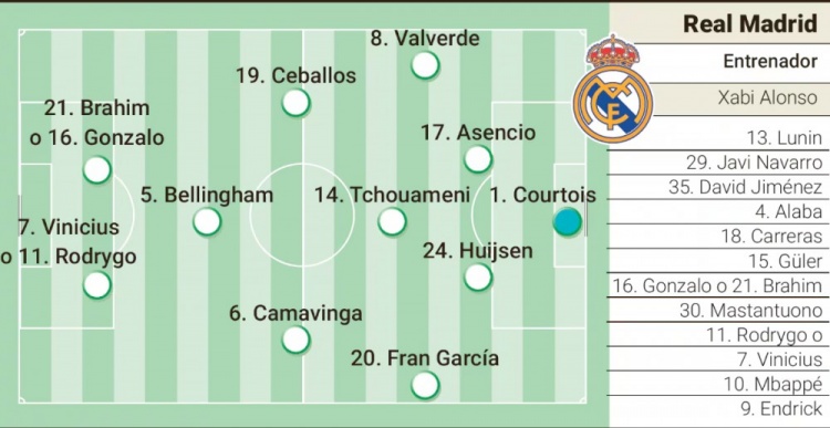 据《阿斯报》预测首发为:库尔图瓦;巴尔韦德、劳尔-阿森西奥、赫伊森、弗兰-加西亚;琼阿梅尼、卡马文加、塞巴略斯、贝林厄姆;迪亚斯或贡萨洛、维尼修斯或罗德里戈。
